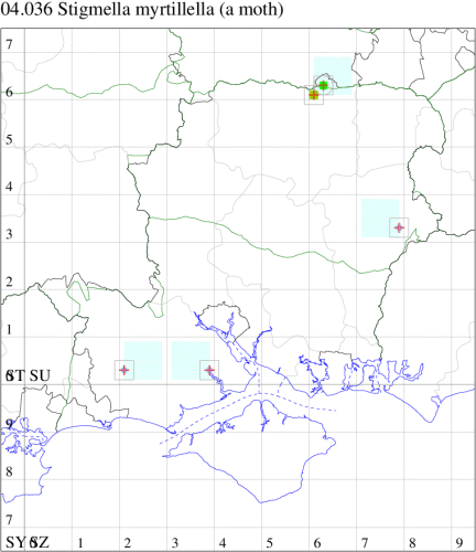 Local in woodland, heathland and moorland throughout much of Britain, reported as favouring high ground. There are old records for Burley and Beaulieu in the south of the county and Woolmer Forest in the north, with evidence of occurrence in the Pamber Forest area more recently. Not recorded from the Isle of Wight to date. In July, and later in autumn, the larva mines the leaves of Bilberry (and away from our area, Bog Bilberry), forming a contorted gallery with a central line of frass, which then widens out to a false blotch. The adult has dark purplish wings with a whitish fascia, orange head and white eyecaps, but will generally need rearing or dissection to be accepted in this stage.