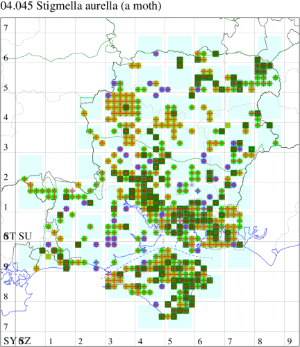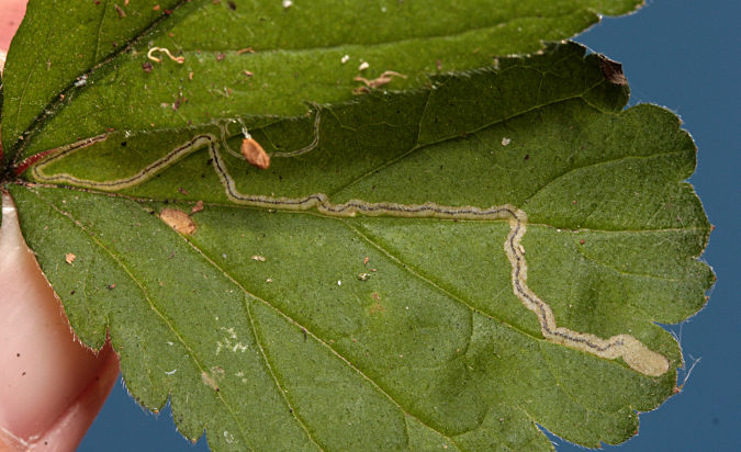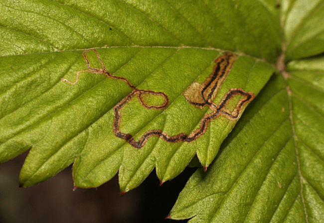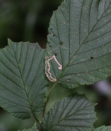 Common often abundant throughout the British Isles, less numerous in Scotland (records have been made from every recorded 10km square in the country). A widespread and abundant in Hampshire and on the Isle of Wight, found virtually wherever the foodplants are present: any patch of bramble, even isolated plants, may exhibit the distinctive trail of the vacated mine of this species. Larva mines leaves of Bramble, Agrimony, Tormentil, Water Avens, Wood Avens and Wild Strawberry (the species was formerly divided into several different species on the basis of the various larval food plants utilised.) The long, sinuous mines are described in the following link: