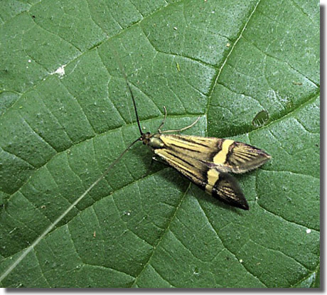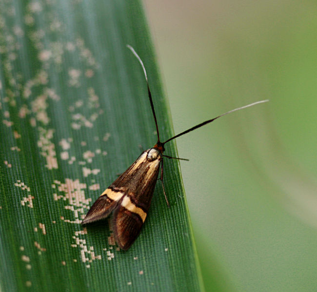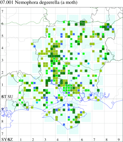 Common in deciduous, often damp, woodland throughout England and Wales. Frequently recorded and well distributed across much of Hampshire and the Isle of Wight. Wingspan 17-23 mm. Unmistakable; male has very long antennae. Larva feeds on leaf litter, living within a movable case.