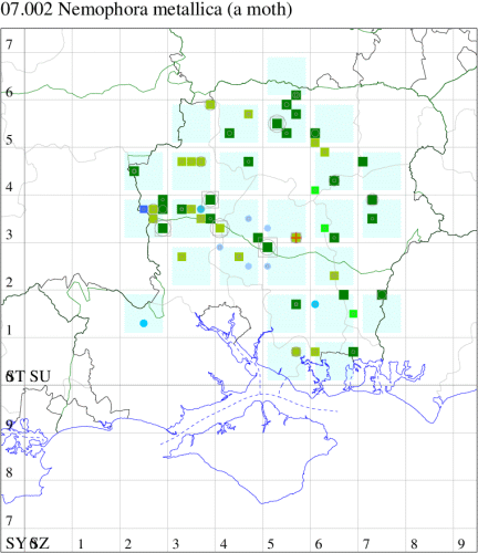 Nationally scarce (Nb) in dry pastures and chalk downland throughout much of south-eastern England. In Hampshire very local on the remaining downland in both vice-counties, most notably between Porton Down and Leckford. Not recorded from the Isle of Wight to date. Wingspan 15-20 mm. Larva feeds on seeds of Field Scabious and Small Scabious, subsequently feeding in the fallen leaves, living within a movable case.
