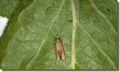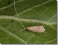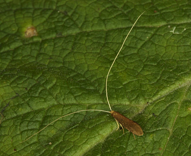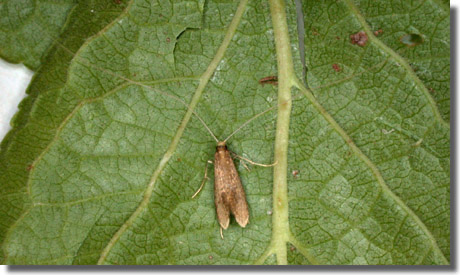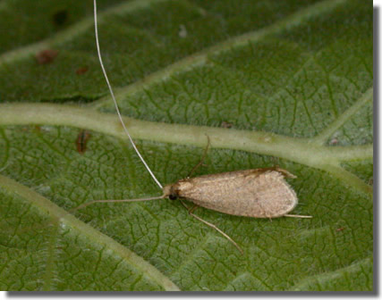N. swammerdamella, with long white antennae and yellow-orange head tufts, but smaller and with hint of a discal spot; flies later in the year (MBGBI Vol 1). Larva feeds on dead leaves, living within a movable case, over-wintering twice.