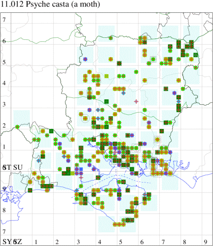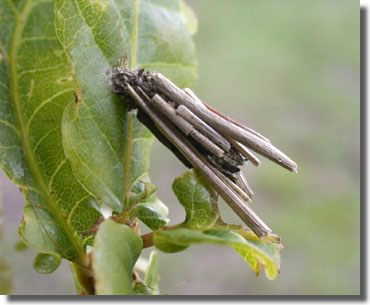 Common throughout the British Isles, less numerous in the north. Widespread and common in Hampshire and on the Isle of Wight. Wingspan male 11-15 mm, female wingless. The distinctive case of the larva is often easily found attached to leaves and tree trunks, while the winged male is very infrequently observed, but will occasionally come to light; male dull brown, female wingless and grub-like, generally smaller than the much scarcer