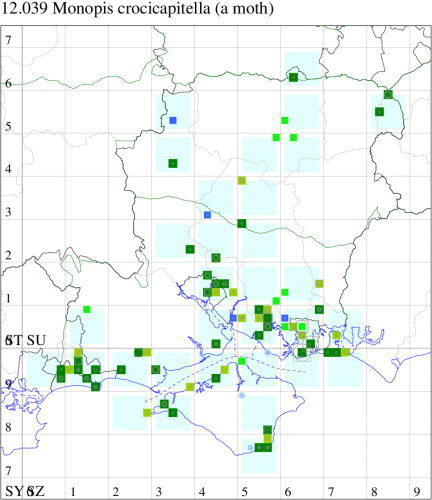 M. obviella, in maritime areas as far north as Yorkshire and especially in the south-west and Ireland. In Hampshire and on the Isle of Wight frequent only in the south-east of the county. Wingspan 10-16 mm. Very similar to