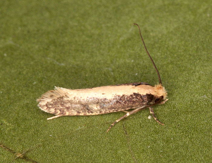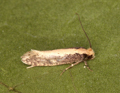 Monopis crocicapitella : hind margin of the forewings and forehead crest cream to light brown. 12-16 mm; ground colour of the forewings not very variable, usually much lighter than in Monopis obviella .