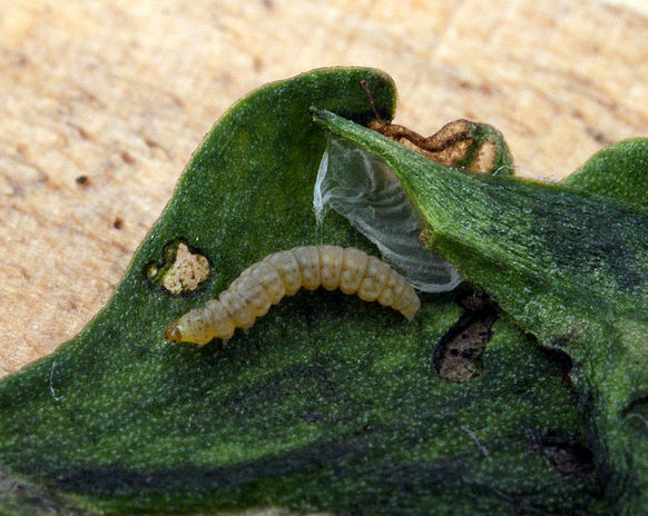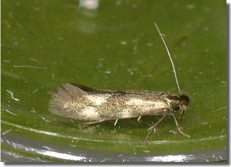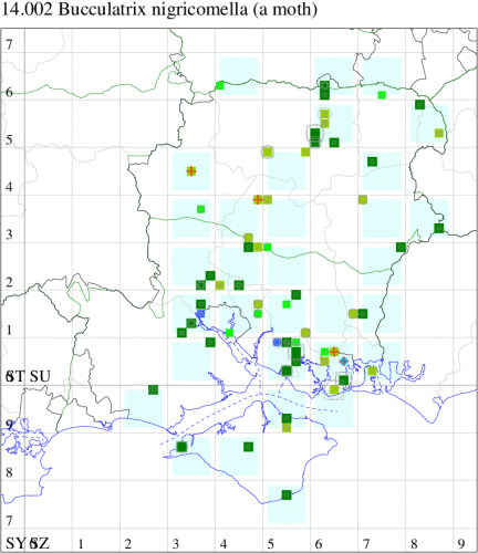 Local on embankments, waste ground and rough grassland throughout the British Isles. In Hampshire mainly confined to the coast, east of Southampton, very uncommon elsewhere. Recorded on the Isle of Wight for the first time at Freshwater in 2010. Wingspan 7-8 mm. Flies in the late afternoon and early morning. Distinguished from other Bucculatrix by dark metallic bronze ground colour, with diffused whitish spots on dorsum at one-half and three-quarters and two similar spots on costa slightly beyond, and white eye-caps (MBGBI Vol 2). Larva mines leaves of Ox-eye Daisy.
