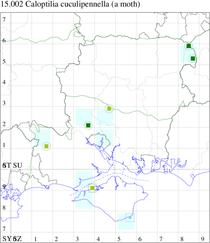 Scarce in Britain as far north as Perthshire and in Ireland, especially on sea-cliffs and rough ground near the sea and woodland inland. Very rare in our area: Ffennell reported one from the Southampton area in 1935, and there are three old records from the Isle of Wight. Recent years have seen a scattering of further examples, with the first for North Hampshire coming in 2020. Wingspan 11-12 mm. Beware confusing the far more widespread and common