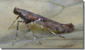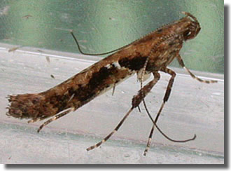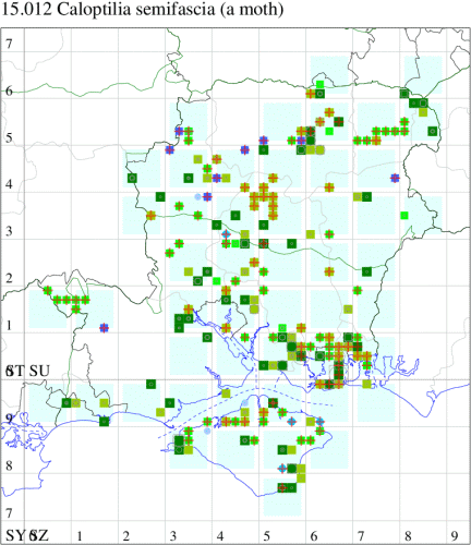 Local in woodland edges and hedgerows in southern England and Wales, widespread, but tending to occur in isolated but sometimes populous colonies; absent from the north Midlands, but reappearing in Yorkshire and Cumbria. Widespread and fairly common in Hampshire and on the Isle of Wight. Wingspan 10-12 mm. Since the synonymisation of C. hauderi into the present species, it is apparent that the adult is bivoltine, with a small first generation in spring, followed by a main emergence from July through September, remaining active into October before overwintering into the next year (Nota Lep. (2011), J.R.Langmaid).