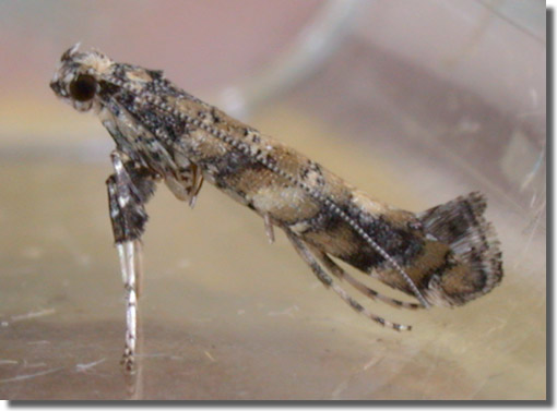 C. cuculipennella. Larva mines leaves of Privet (both wild and cultivated), Ash and Lilac, subsequently living gregariously within a leaf-roll, causing sufficient damage to be a serious pest in some areas, over-wintering as a pupa.