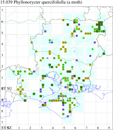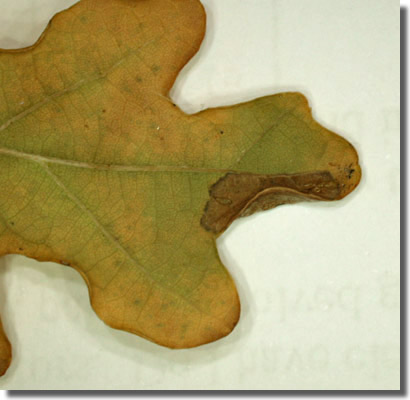 P quercifoliella the apical streak extends to almost two-thirds and terminates slightly beyond the apices of the first pair of strigulae (MBGBI Vol 2). Imago fairly regular at light, but more frequently recorded in the larval stage, when mines are relatively easy to find where they are present. Larva mines leaves of deciduous oaks