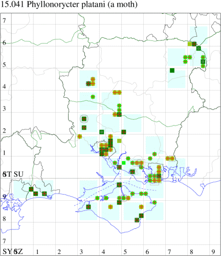Local in parks and urban areas, discovered new to Britain in London in 1990, since when it has spread through the southern counties of the UK and has reached the West Country and Midlands. Found in Hampshire for the first time in 1998 in Southampton and on the Isle of Wight in 2004, becoming more frequent and widespread. Wingspan 9-10.5 mm. Imago seldom encountered at light, and more likely to be recorded in the larval stage, when mines are relatively easy to find where they are present. Larva mines leaves of London Plane in late autumn and are large and obvious, one leaf often hosting several, over-wintering as a pupa in a cocoon.