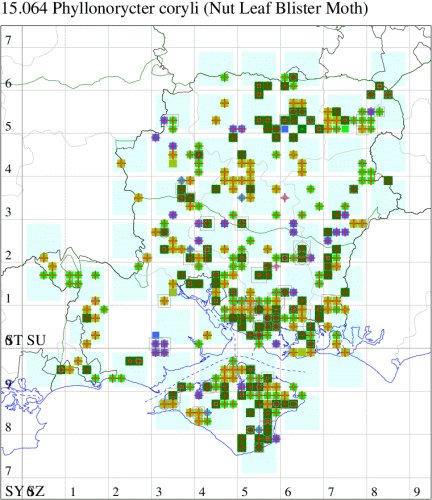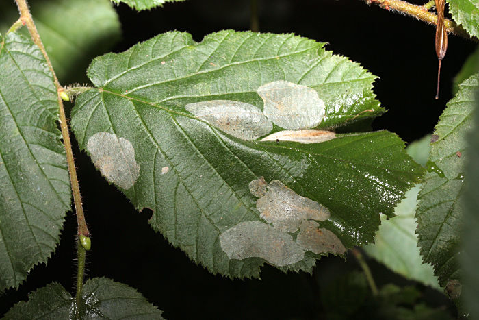 Very common in woodland, scrub and hedgerows throughout much of the British Isles, except for the Northern Isles. In Hampshire and on the Isle of Wight abundant wherever hazel occurs (it likely occurs in virtually every 1-km square in the county where hazel grows). The mine is one of the most easily found in the autumn countryside, forming a silvery, upper-side blotch, crossing veins and there may be multiple on the same leaf. The mine may contract later to cause leaf to fold upwards. The adult moth, like many Phyllonorycter species, is less distinctive and unless bred from a mine, records will require dissection for acceptance: given the ease of identification at the larval stage, this is probably not worthwhile.