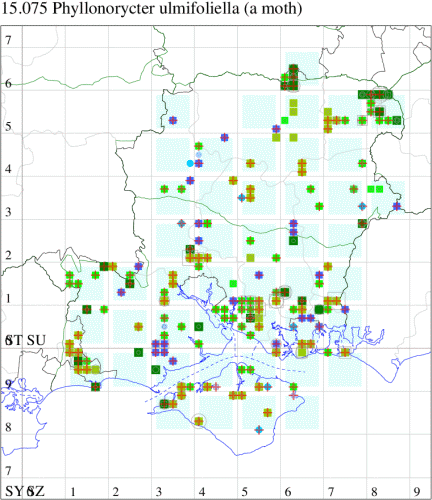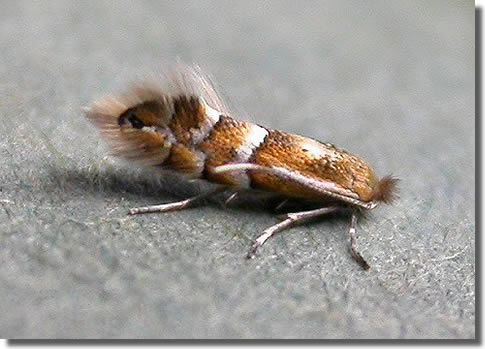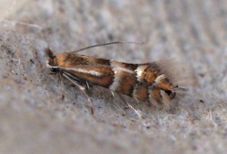 Widespread and common in birch woodland, with most records being of the leaf mine. Wingspan 7-9mm. Forewing golden-brown, with four costal and three dorsal white strigulae, dark edged inwardly, with a white dark-edged basal streak to one-third. The first pair of strigulae meet to form a slightly curved fascia; dorsal strigulae 2 and 3 lie between the remaining three costal marks, the second pair nearly meeting to form a second fascia, as can the third pair. Sometimes has a pale dorsal patch between the base and the first fascia.