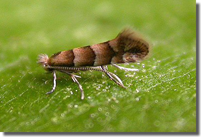Common in woodland throughout much of the British Isles, but more plentiful in the south. In Hampshire and on the Isle of Wight widespread and common. Wingspan 7-8 mm. Imago similar to