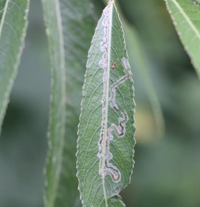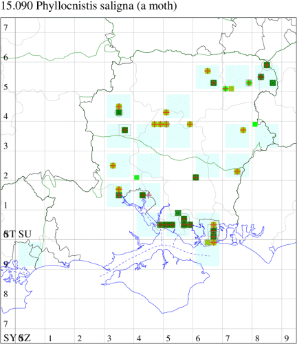 Local in fens, marshes, river-banks and other damp areas throughout southern England. In Hampshire known only from a handful of sites, including Fleet, Greywell Moors, Southsea and Leckford, but perhaps under-recorded. Not recorded from the Isle of Wight to date. Wingspan 6-7 mm. The imago can be separated from other Phyllocnistis only by dissection of the genitalia (females only, males are indistinguishable). Larva mines leaves of Purple Willow
