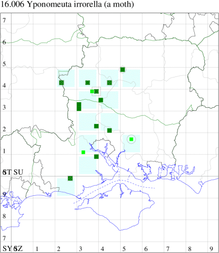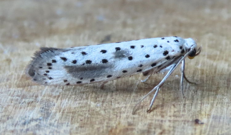 Vulnerable (proposed as a future Red Data Book species) and recorded only from woodland on chalky soils in parts of Hampshire and Kent. Very local and occasional in Hampshire, first recorded in 2001 when nine were trapped on The Moors Local Nature Reserve, Bishop's Waltham. Not recorded again until 2008, when an individual was recorded to light in the New Forest, with another the following year from Longstock in the Test valley. However, since 2020 this species has become regular in small numbers, the majority again from sites in the Test valley; the reason for this uptick in reports is not clear - it may previously have been a rare migrant from the continent which has now become established; it has not been recorded from the Isle of Wight to date. Wingspan 19-25 mm. Larva feeds on Spindle, living within a silken web.