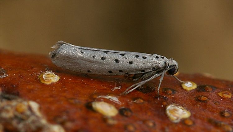 Yponomeuta, distinguished by the grey head, pale grey wing and lack of dots in the terminal area. Most likely to be confused with darker individuals of