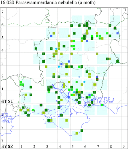 Common in hedgerows and open woodland throughout the British Isles, but not in the north. The distribution in Hampshire mirrors those areas in which trapping effort is concentrated, and the moth is probably more widely distributed than the records suggest; only recorded once on the Isle of Wight. Wingspan 11-14 mm. Characterised by the absence of distinguishing field characteristics, predominately grey, with a white head. Larva mines leaves of Hawthorn, Rowan and Dog Rose, subsequently living within a silken web, often several together.