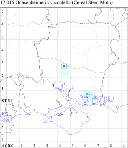 Nationally scarce (Na) in open woodland, grassland and around arable fields, sometimes exploiting outhouses, in which it may aestivate, in parts of England. In Hampshire the only good records are of one at Southwick in 1987 and of several moths together under the bark of a larch on Teg Down in 1990. Not recorded from the Isle of Wight to date. Wingspan male 11-12 mm, female 12-14 mm. Larva mines stems and leaves of Rye, Perennial Rye-grass, Sheep's-fescue and various grasses, over-wintering as an egg.