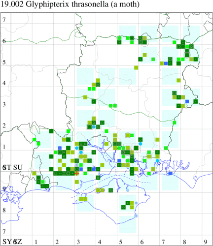 Common in a wide range of marginal, aquatic habitats, including bogs, damp heathland and mosses, throughout the British Isles. Widespread and fairly common in Hampshire and on the Isle of Wight. Wingspan 10-15 mm. Generally considered to be day-flying, but often recorded over-night at light traps. The