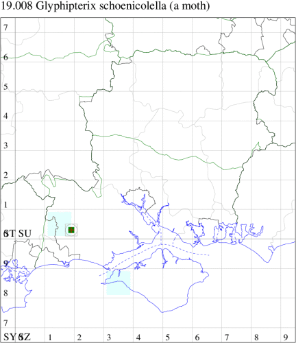 Nationally scarce (Na) in fens, bogs and dune slacks from Dorset to Cornwall, in the fens of East Anglia, in the west and north of Scotland and in the west of Ireland. In Hampshire the foodplant occurs very locally in the New Forest, but the moth had not been found until February 2023, when Jack Oughton found larva to be plentiful in the Burley area. There is a single old record from the Isle of Wight. Wingspan 6-9 mm. The adult moth is very similar to