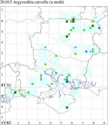 Local in gardens and orchards throughout England and Wales, extending to Perthshire and the Western Isles in Scotland (MBGBI Vol 3). In Hampshire rather uncommon, given its reputation as a pest in orchards, but perhaps under-recorded: the first records for the Isle of Wight since 1925 were reported in 2022. Wingspan 10-12 mm. Similar to
