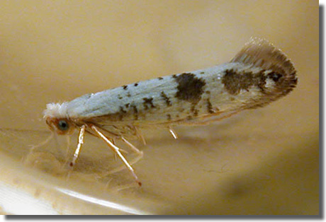 A. sorbiella, from which it is distinguished by its smaller size and the colour of the markings which are almost greyish brown on a clear white ground colour (MBGBI Vol 3). Larva mines buds and shoots of Apple, causing sufficient damage to be a serious pest in some areas, over-wintering as an egg.