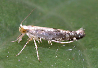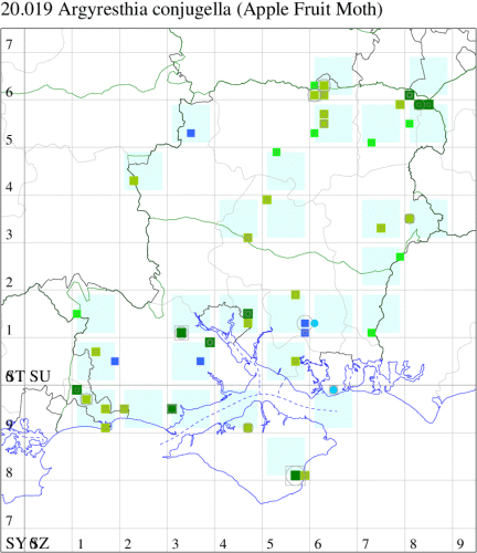 Common in orchards and woodland throughout the British Isles, more numerous in the north. Rather uncommon in Hampshire. Not recorded from the Isle of Wight to date. Wingspan 10-14 mm. Day-flying, but may come to light. Similar species include