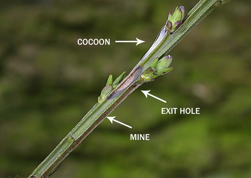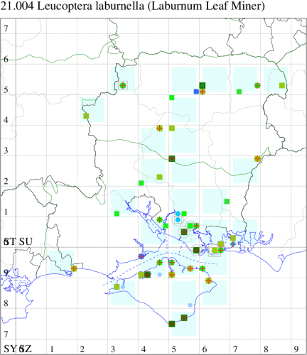 L. spartifoliella; easily overlooked and not particularly common at light; more frequently recorded in the larval stage, when mines are relatively easy to find where they are present. Larva mines leaves of