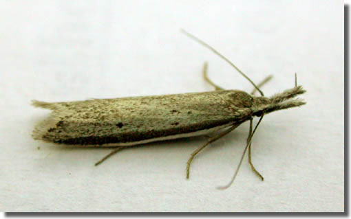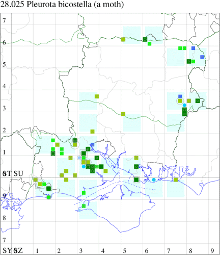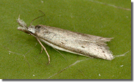Local on moorland and heathland throughout the British Isles. In Hampshire rather infrequently recorded on the heaths of the New Forest and in the north-east of the county, but remaining extremely rare on the Isle of Wight. Wingspan 23-25 mm. Large labial palps, with upward pointing tips, white costal streak and pair of small black discal spots; superficially similar to
