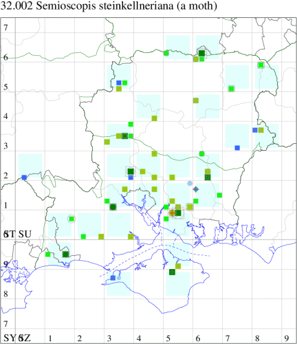 Local in hedgerows and scrub, especially in blackthorn-thickets, across most of Britain, except in extreme south-west England and northern Scotland. In Hampshire and on the Isle of Wight recorded in most years, but with no discernible increase in numbers, despite the increase in observer coverage, so the decline is probably more serious than the records suggest. Wingspan 18-23 mm;
