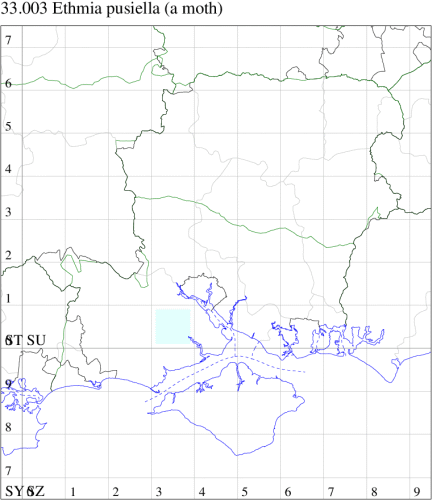 Occurrence in the British Isles unconfirmed. Formerly reported from woodland and scrub in Beaulieu, south Hampshire, and Dover, Darenth Wood and Gravesend, Kent; the few British records date back to the early part of the 19th Century, but there is no evidence to suggest that the moth was ever resident in Britain (MBGBI Vol 4 part 1). Wingspan 25-34 mm. Larva feeds on Common Gromwell, living between flowers and leaves spun together with silk.