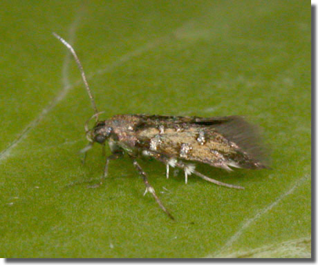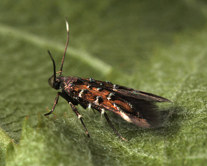 P. schwarzella, but differs in its smaller wingspan, the perpendicular position of the second silver spot on the tornus of the forewing and in both sexes by the broad white subapical section of the antenna (MBGBI Vol 4 part 1). Larva mines petioles of Hairy Violet and Common Dog-violet, subsequently living in the roots and feeding on the bark, over-wintering as a pupa.