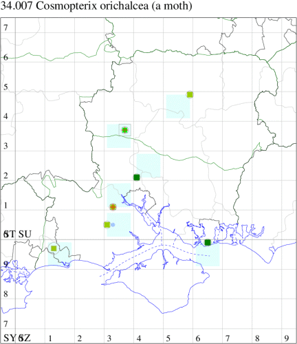 Nationally scarce (Na) in damp meadows, fens, marshes and by river-banks in parts of southern England and Wales, rare elsewhere. In Hampshire virtually restricted to the Leckford Estate, where known for many years; elsewhere, there is only one recent record, at Hurn near Christchurch in 2007. Not recorded from the Isle of Wight to date. Wingspan 8-10 mm. The large triangular golden metallic spot on the forewing from base to the middle of the basal area, and an uninterrupted apical line in combination with the two white subapical rings of the antenna distinguish it from allied species (MBGBI Vol 4 part 1). Larva mines blades of Reed Canary-grass, Sweet Vernal-grass, Common Reed, Wood Millet and Holy-grass, over-wintering in a cocoon.