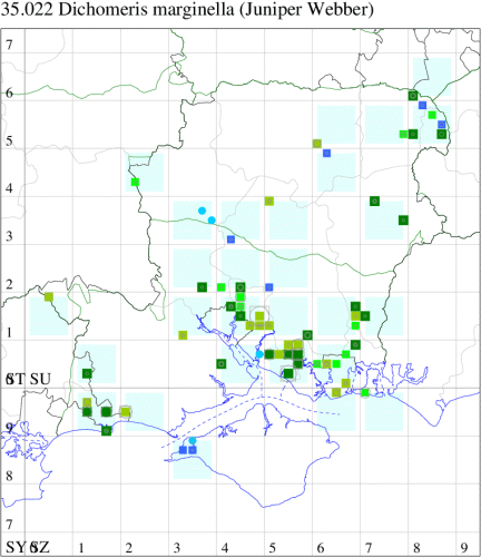 Local on chalk and limestone downland, and, on cultivated forms of the foodplant, in gardens throughout much of England; also in South Wales and on the Burren. In Hampshire most likely to be encountered in the south-east and the extreme north-east of the county, and largely absent from the New Forest and much of north Hampshire. On the Isle of Wight, known only from Freshwater, where first recorded in 1989, and again in 1995 and 1996. Wingspan 15-17 mm. Unmistakable. Larva feeds within needles of Juniper, subsequently living within a silken web.