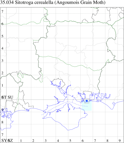 Recorded infrequently through accidental importation in grain from southern Europe in barns, warehouses and granaries, where it can become established, also has the potential to appear as a migrant on the south coast. In Hampshire recorded for the first time at Southsea on 28 July 1995. Not recorded from the Isle of Wight to date. Wingspan 11-19 mm. Quite similar to other gelechiids, especially some Metzneria. Larva feeds within seeds of Wheat and Maize, causing sufficient damage to be a serious pest in some areas.