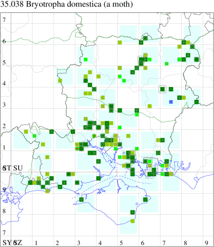 B. domestica by the much darker hindwing (MBGBI Vol 4 part 2). Larva feeds on various mosses, often on walls, living within a silken gallery.