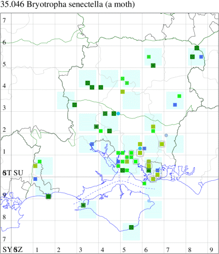 Local in urban areas, old buildings and rocky areas throughout the British Isles, except for the Highlands and Islands of Scotland. In Hampshire frequent only in the south-east, and very much less common elsewhere in the county and on the Isle of Wight. Wingspan 9-13 mm. The brown colour and the dark line running over the vertex of the head distinguish