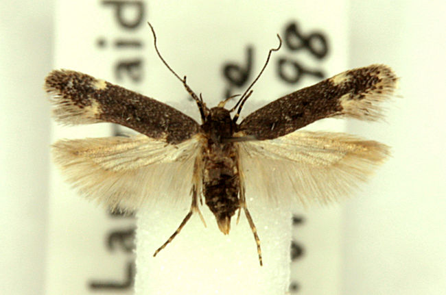 B. similis by the conspicuous clear white costal and tornal patches contrasting with the very dark forewing (MBGBI Vol 4 part 2). Larva feeds on various mosses and various grasses, living within a silken tube or tent.