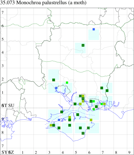 Nationally scarce (Nb) in waste ground, dry pastures and sand-dunes, south-east of a line from Somerset to Norfolk (MBGBI Vol 4 part 2). In Hampshire the main population is found in the south of the county, notably at Southsea, Funtley and Lower Test Marshes, where first confirmed for Hampshire in 1992; there is one record from the north of the county, at Bramley Frith Wood in 1999, and a few from the Isle of Wight, after the first at Cranmore in 1997. Wingspan 15-19 mm. Larva feeds within roots and lower stems of Curled Dock and Dock, over-wintering as an egg or small larva.