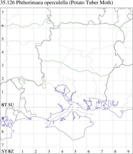 Suspected rare immigrant, or perhaps accidentally imported, from southern Europe. Usually discovered as larvae in produce purchased from supermarkets, although occasionally taken at light under circumstances consistent with arrival as genuine migrants. Not recorded in Hampshire or on the Isle of Wight to date. Wingspan 14-15 mm. Identification depends on dissection of the genitalia. Larva feeds on Potato and Tomato, causing sufficient damage to be a serious pest in some areas, over-wintering as a pupa.