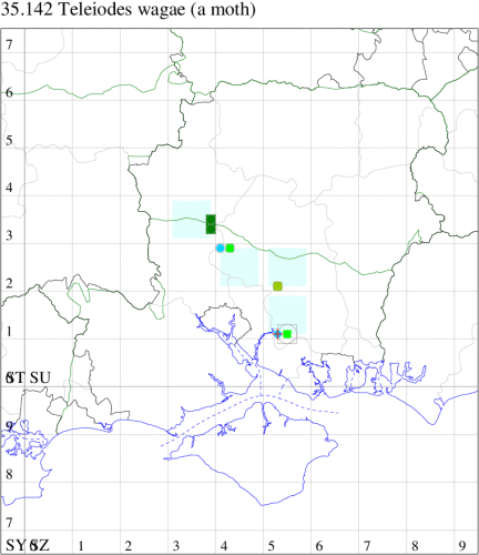 T. wagae has four black dots in that area. Larva feeds on Hazel, Birch and Sweet Chestnut, living within a spun or rolled leaf, over-wintering as a pupa.