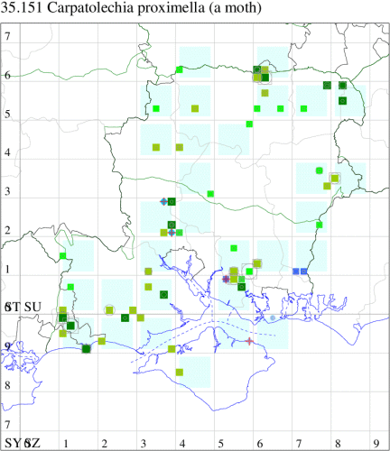 Common in open woodland and scrub throughout the British Isles. In Hampshire recorded annually in small numbers from widely scattered locations across the county. Not recorded from the Isle of Wight since 1977. Wingspan 13-16 mm. The main confusion species is
