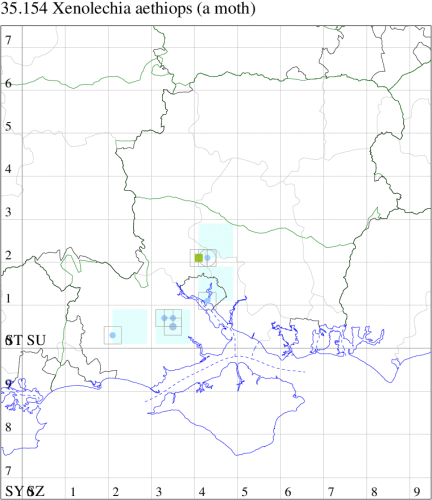 Rare (proposed as a future Red Data Book species) on heathland and moorland in parts of Britain, formerly more widespread. Recorded in Hampshire for the first time at Chandlers Ford on 7 May 1922, then intermittently near Beaulieu Road station and at a few other sites in and around the New Forest from 1938 until 1973, but apparently not since. Not recorded from the Isle of Wight to date. Wingspan 16-20 mm. Similar to dark specimens of