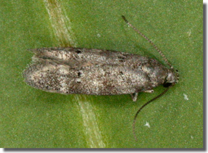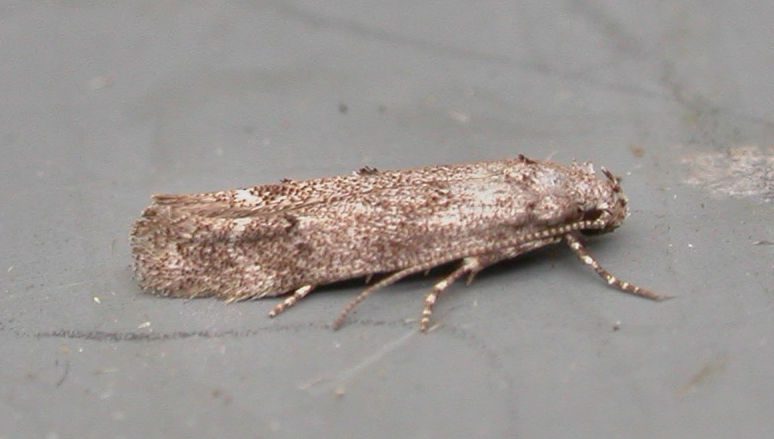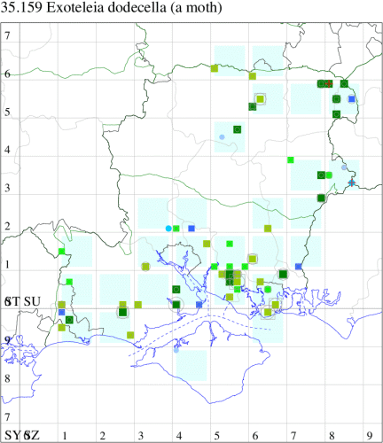 Local in pine woodland and plantations throughout much of the British Isles, except for the Northern Isles. Probably under-recorded in Hampshire, where the extent of known records correlate with those areas in which the recording effort is concentrated; there have been no recent records from the New Forest. Not recorded from the Isle of Wight since 1900. Wingspan 12-15 mm. When worn, resembles several other gelechiids, from which only reliably separated by dissection of the genitalia. Larva feeds within needles of Scots Pine, Corsican Pine and Maritime Pine, subsequently living within a silken web, causing sufficient damage to be a serious pest in some areas.