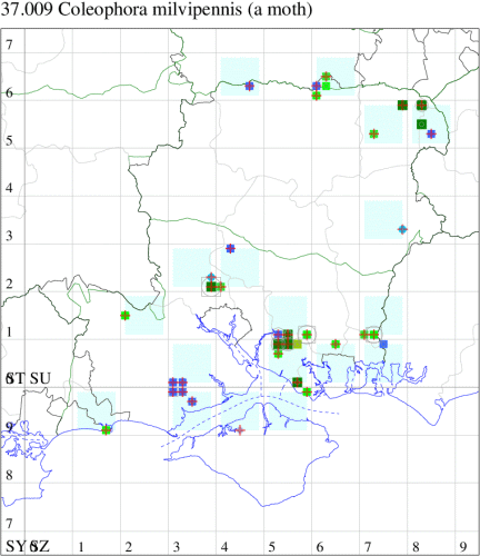 Local on heathland and in open woodland throughout much of Britain; rare in Ireland. Probably under-recorded in Hampshire and on the Isle of Wight, where the extent of known records correlate with those areas in which the recording effort is concentrated. Wingspan 10.5-13 mm. Like many of the Coleophora, imagines are virtually impossible to identify without recourse to dissection, and the larvae, which live in cases of characteristic form and which can sometimes be found on the foodplant, may be easier to identify by comparison against a reference collection. Larva mines leaves of Birch, living within a movable case.