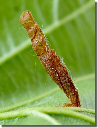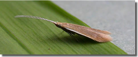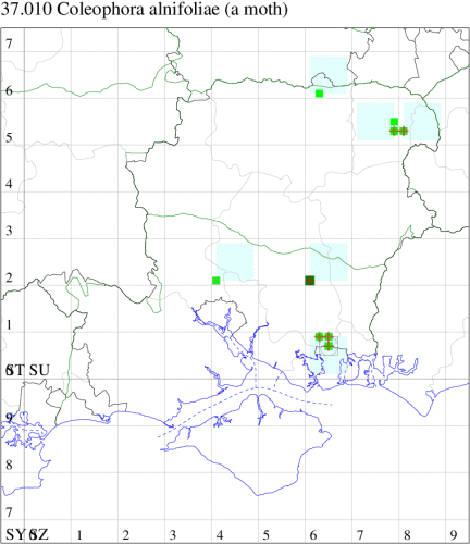 Nationally scarce (Nb) in woodland and freshwater margins in small, isolated colonies in south-eastern and central southern England, as far north as Shropshire; Perthshire (MBGBI Vol 3). In Hampshire apparently restricted to Pamber Common Hook Common and Fleet in the north, and Hookheath Meadows NR in the south. Not recorded from the Isle of Wight to date. Wingspan 12-13 mm. Like many of the Coleophora, imagines are virtually impossible to identify without recourse to dissection, and the larvae, which live in cases of characteristic form and which can sometimes be found on the foodplant, may be easier to identify by comparison against a reference collection. Larva mines leaves of Alder, living within a movable case, over-wintering twice in some areas.