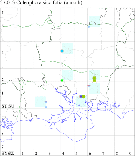 Nationally scarce (Nb) in hedgerows and heathland throughout much of Britain, but not in northern Scotland. In Hampshire continues to be recorded very infrequently, latterly at Botley Wood in 1990. Not recorded from the Isle of Wight to date. Wingspan 12-14 mm. Like many of the Coleophora, imagines are virtually impossible to identify without recourse to dissection, and the larvae, which live in cases of characteristic form and which can sometimes be found on the foodplant, may be easier to identify by comparison against a reference collection. Larva mines leaves of Birch, Hawthorn, Apple and Rowan, living within a movable case, over-wintering twice.