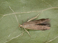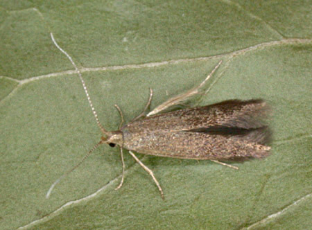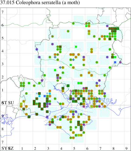 One of commonest species of Coleophora, in woodland, hedgerows, heathland and fens throughout much of the British Isles, except for the far northern islands of Scotland. In Hampshire and on the Isle of Wight common and widespread. Wingspan 10.5-14 mm. Like many of the Coleophora, imagines are virtually impossible to identify without recourse to dissection: the indistinct rings near the tip of the antenna help to distinguish it, but examination of the genitalia is required for positive identification of non-reared specimens.
