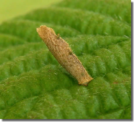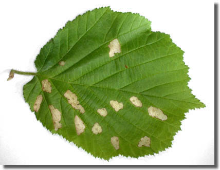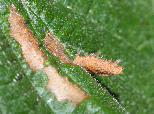 The larva mines leaves of Birch, Alder, Elm and Hazel, living within a movable case, creating small mines which leave a characteristic pattern on the surface of the leaves of its foodplants, birch, elm, alder or hazel. Confusion can occur when it is occasionally found feeding on other trees, or on herbaceous plants onto which it has accidentally fallen.