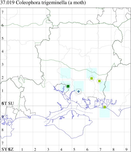 Nationally scarce (Na) in hedgerows and scrubland in parts of south-eastern England, with records north to Yorkshire. In Hampshire there are few records of this species, but it is probably overlooked on account of the difficulty of finding the larva. Not recorded from the Isle of Wight to date. Wingspan 9-10 mm. Imago very similar to